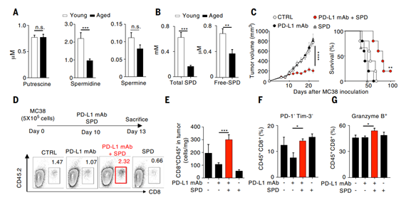 【概要描述】免疫系统能力会随着年龄的增长而下降,对于老年人来说更容易感染以及患上癌症,与年轻人相比常用的治疗方法PD-1抑制疗法在老年人体内通常是无效的。研究表明,在人体中存在一种生物多胺亚精胺会随着年龄的增长而减少,补充亚精胺可以改善或延缓一些与年龄相关的疾病,包括免疫系统的疾病。然而,随着衰老引起的亚精胺缺乏与衰老诱导的T细胞免疫抑制之间的关系尚不清楚。
