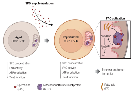 总结,亚精胺通过直接结合和激活MTP来增强脂肪酸氧化。补充亚精胺可以增强脂肪酸氧化活性,提高CD8+T细胞的线粒体活性和细胞毒性功能。研究团队对亚精胺特性有了新的认识,这可能有助于制定策略来预防和改善与年龄有关的免疫疾病的结果,并对抗癌症中对PD-1抑制疗法的无反应性,而不论年龄大小。