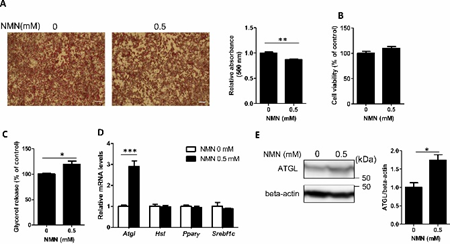 研究团队为了确定NMN对脂肪细胞中脂质储存的影响,用NMN处理分化的3T3-L1脂肪细胞,发现用0.5mM NMN处理四天可显著减少分化的3T3-L1脂肪细胞中的脂质积累。为了确定NMN调节脂肪分解的机制,研究团队检查了与脂肪分解相关的基因表达,发现NMN 通过增加3T3-L1脂肪细胞中的ATGL表达来加速脂肪分解。
